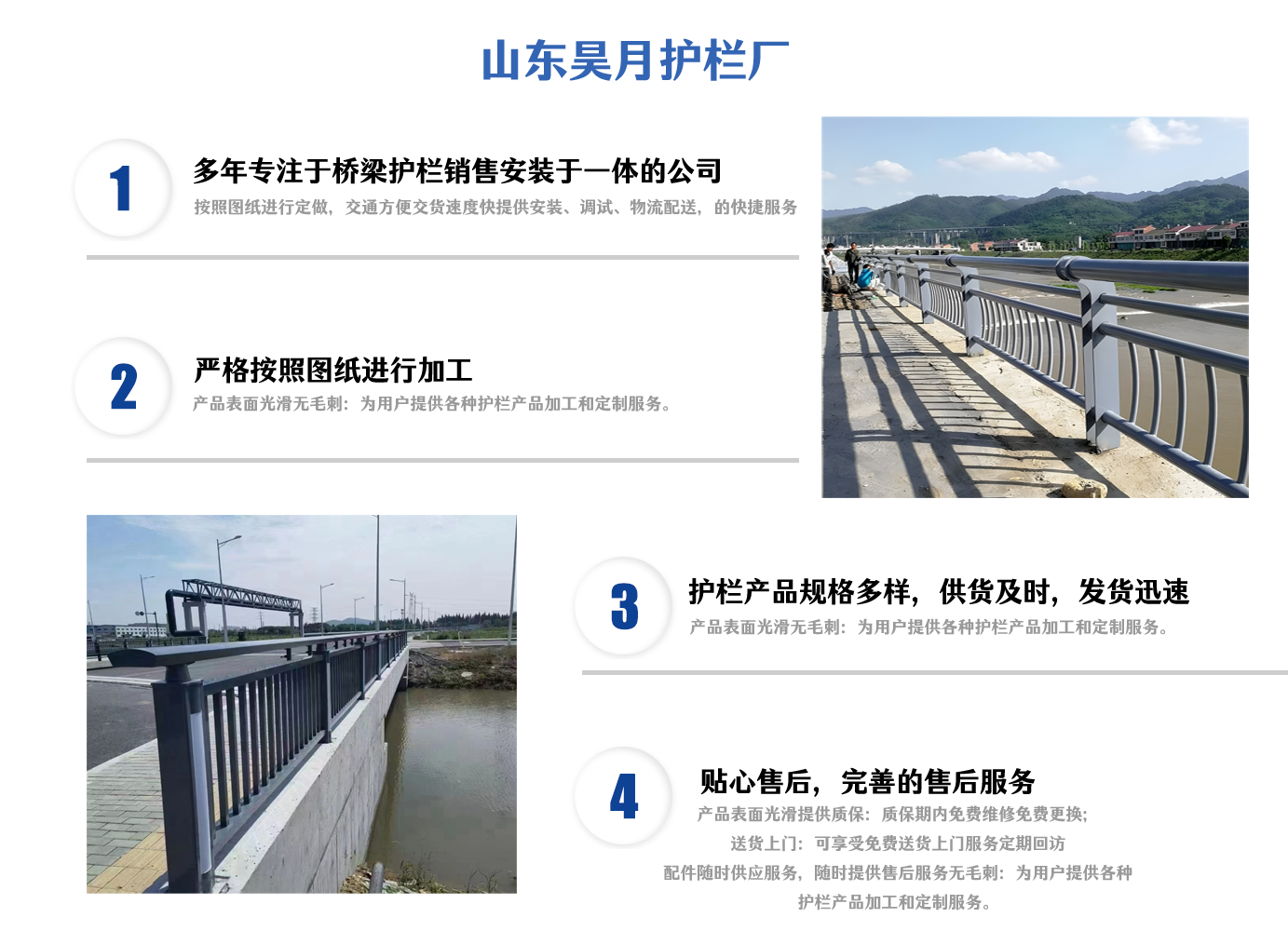 山東昊月金屬制品有限公司坐落于原材料豐富人文和諧交通發(fā)達及有“江北水城”之稱——聊城。 公司以科技興廠為宗旨,積極引進人才和技術(shù),不斷開拓創(chuàng)新. 主營產(chǎn)品:SS級橋梁防撞護欄,不銹鋼復(fù)合管護欄,鋁合金護欄,燈光護欄,河道護欄等等。產(chǎn)品本公司建立了一套科學(xué)的行之有效的質(zhì)量體系,擁有一支高技術(shù)、高素質(zhì)團隊,堅持以“誠信”為本,堅持“優(yōu)質(zhì)的質(zhì)量、貼心的服務(wù)”為崇高理念,為用戶提供質(zhì)優(yōu)價廉的產(chǎn)品提供至真至誠的服務(wù)。與客戶合作雙贏、攜手共創(chuàng)輝煌。 公司以科學(xué)的工藝、嚴格的質(zhì)量管理、完善的服務(wù)理念、合理的銷售價格贏得了良好的聲譽,建立了密切和愉快的合作關(guān)系。多年來,我們一直以良好的品質(zhì)、合理的價格,完善的質(zhì)量保障體系,完善的售后服務(wù)為客戶提供周到的服務(wù),滿足廣大客戶的需求。 我們以信譽求生存,以質(zhì)量去競爭,以真誠換合作,以效益求發(fā)展,是我們的服務(wù)宗旨。我們積極主動與同行加強交流與時俱進,邁向新的歷程!我們竭誠歡迎您的咨詢和洽談,愿與同行業(yè)的同胞們合作共贏。...